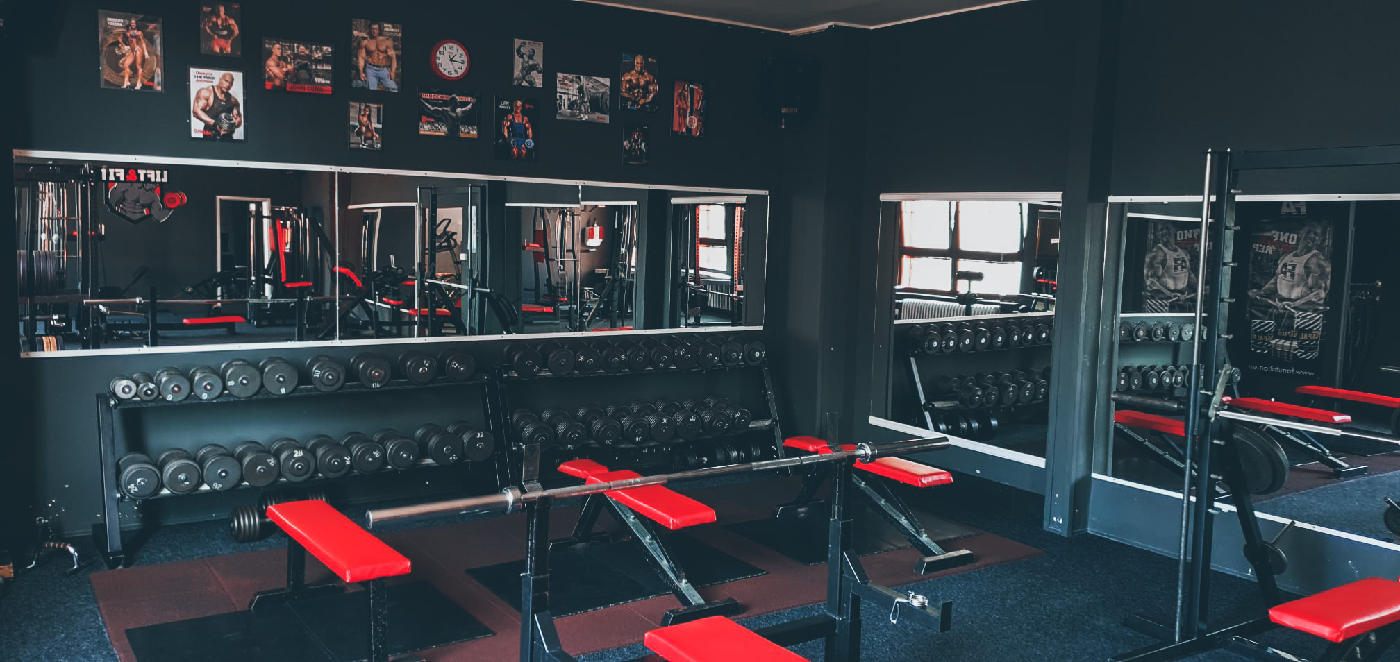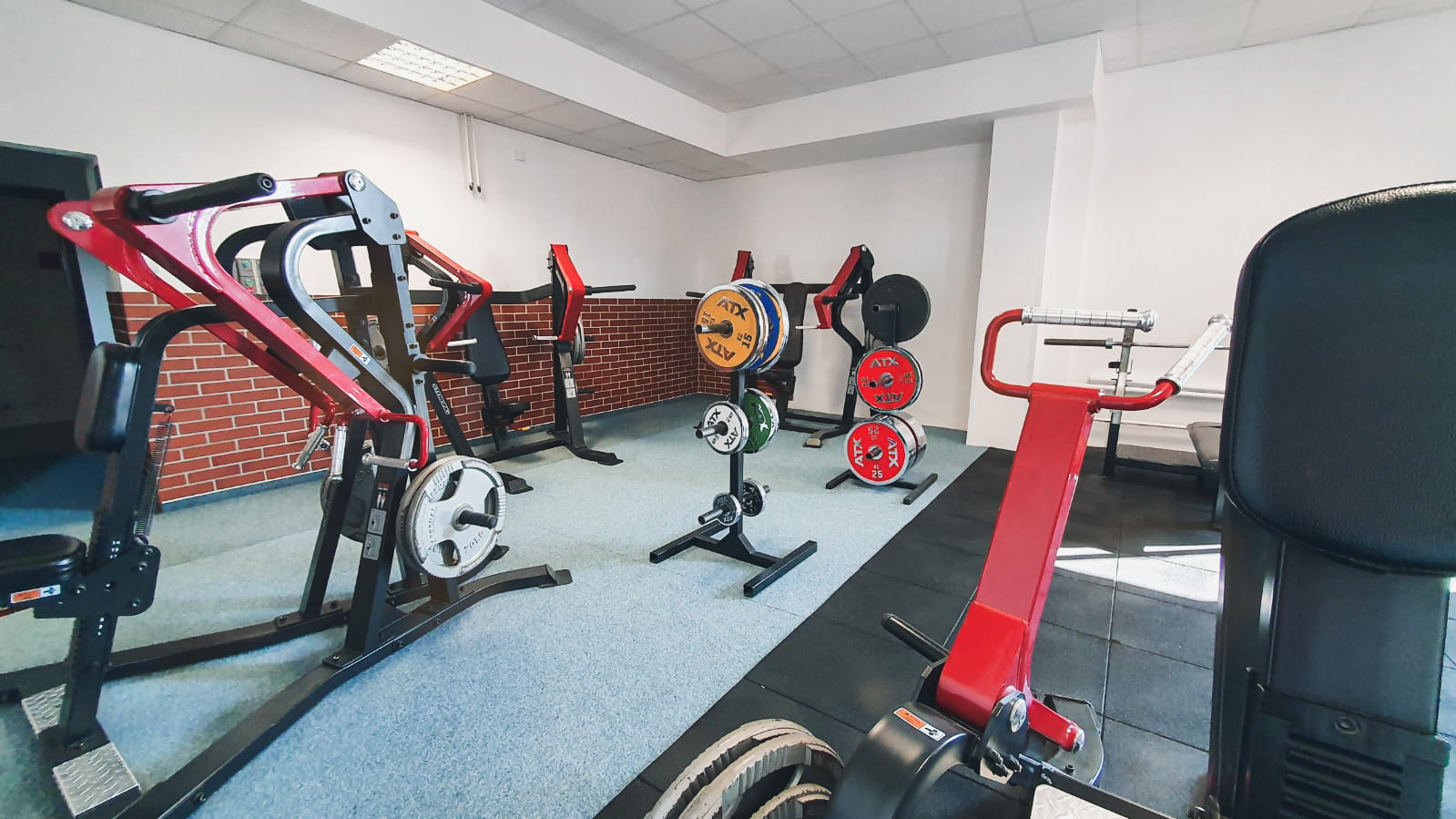 Prostorný sál pro posilování (140 m²) s profesionálními stroji pro začátečníky i profíky. Jednoručky od 1 do 60 kg, originální Texas Deadlift Bar, kotouče LEOKO/Grün Sport/ELEIKO, bench dle závodních parametrů a dřepovací klec s monorackem.